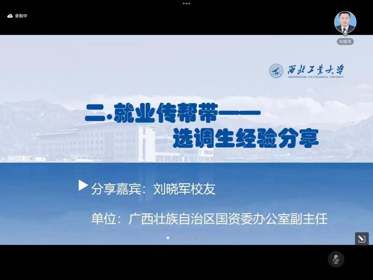 随后,结合自身经历和工作经验,现任广西壮族自治区国资委办公室副主任的2014届校友刘晓军与大家分享了备考选调过程中的宝贵经验。第一,要树立信心,保持乐观,坚持不懈,积极参加考试与招聘;第二,要认真踏实准备,多做真题,善于总结;第三,要关注国家大事、时政热点,提高政治站位。随后,刘晓军学长还告诫大家入职后要尽快适应角色转变,在工作中保持一如既往的“耐心”、一丝不苟的“细心”、履职尽责的“实心”和开拓进取的“创新”。