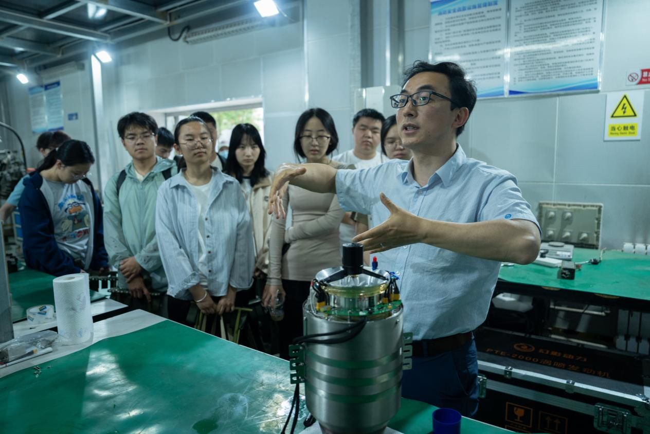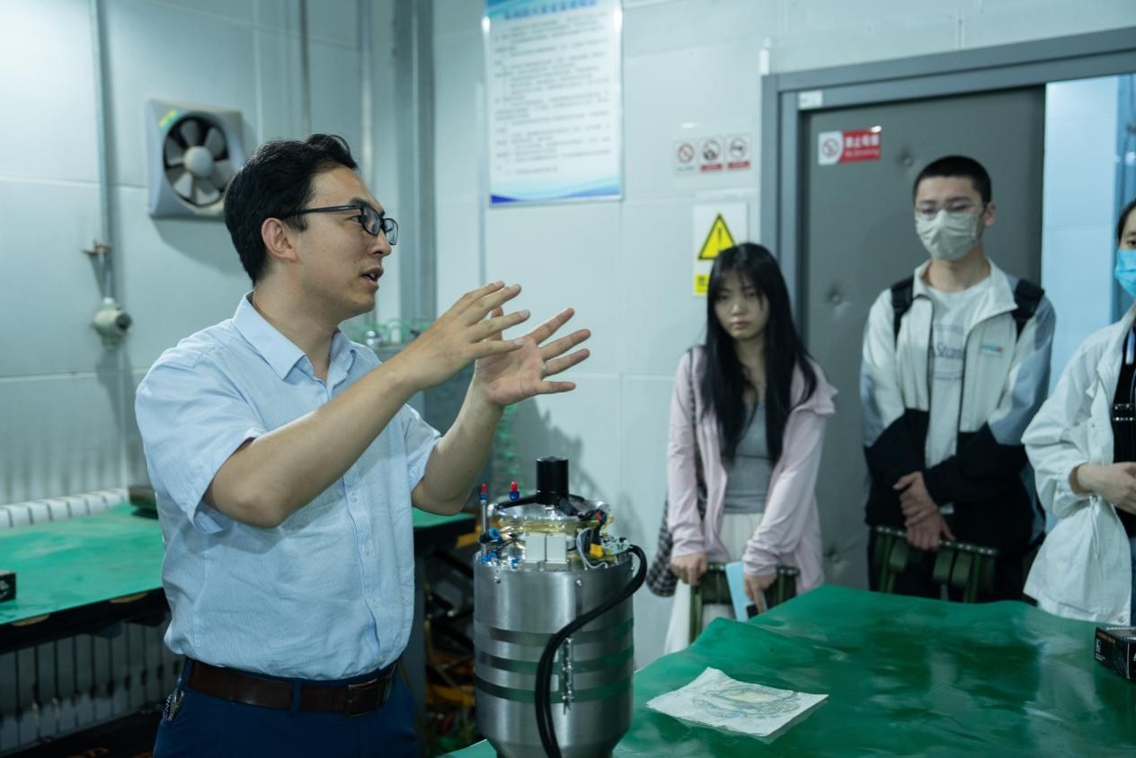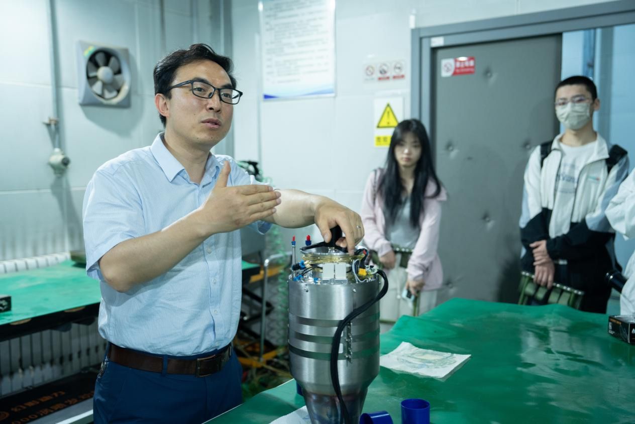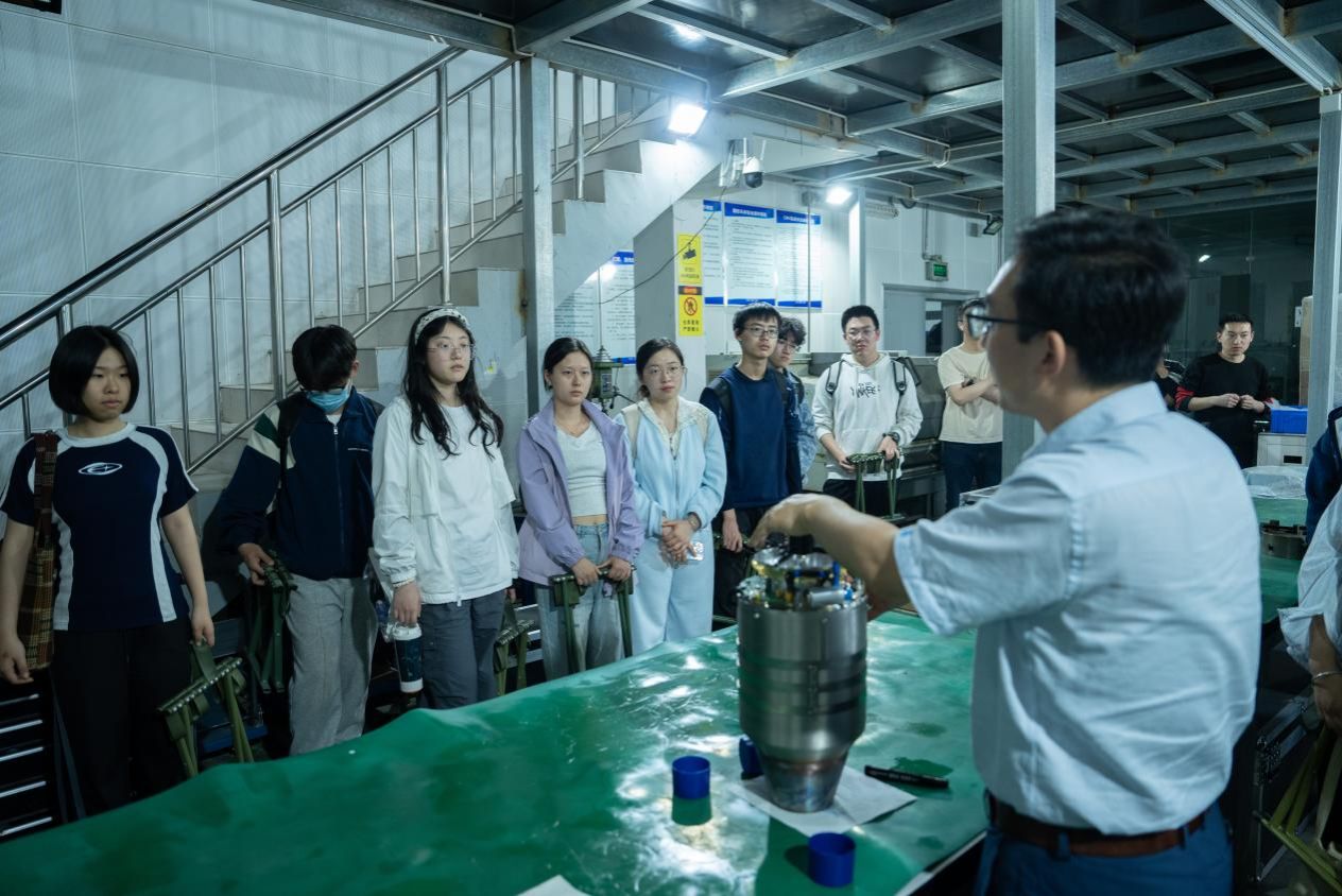贾老师带领同学参观飞行器动力实验中心,亲身感受航空燃气涡轮发动机运转时的澎湃动力,随后通过对发动机核心部件精妙构造及其高效运转原理的深入讲解,让同学们更深刻理解了航空动力的科技魅力。