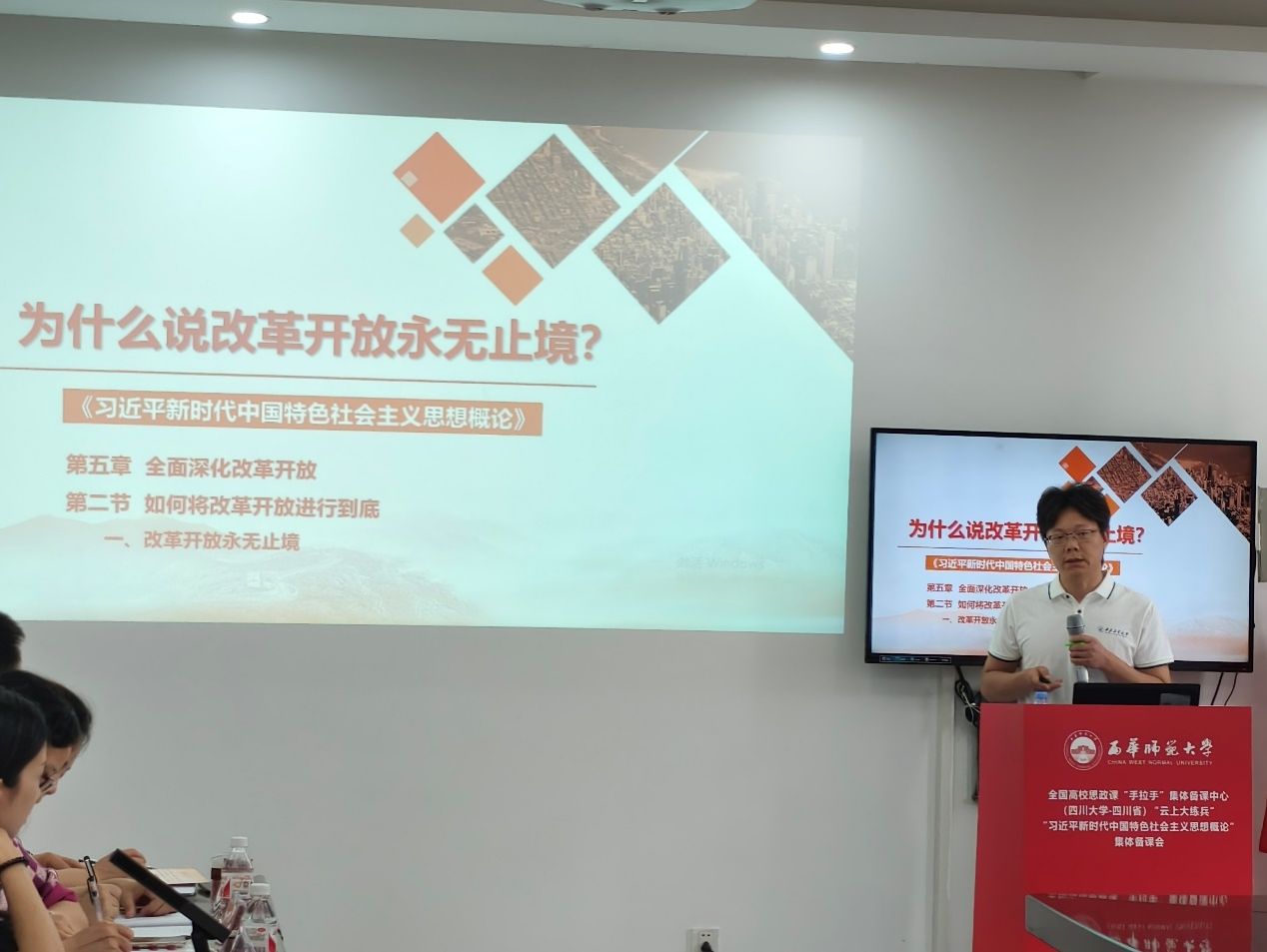 为深入推进习近平新时代中国特色社会主义思想进教材、进课堂、进头脑,切实提升思政课教学质量和水平,6月6日下午,全国高校思政课“手拉手”集体备课中心(四川大学——四川省)“云上大练兵”“习近平新时代中国特色社会主义思想概论”集体备课会在西华师范大学举行。yl8858永利集团教师代表参加了此次集体备课会。