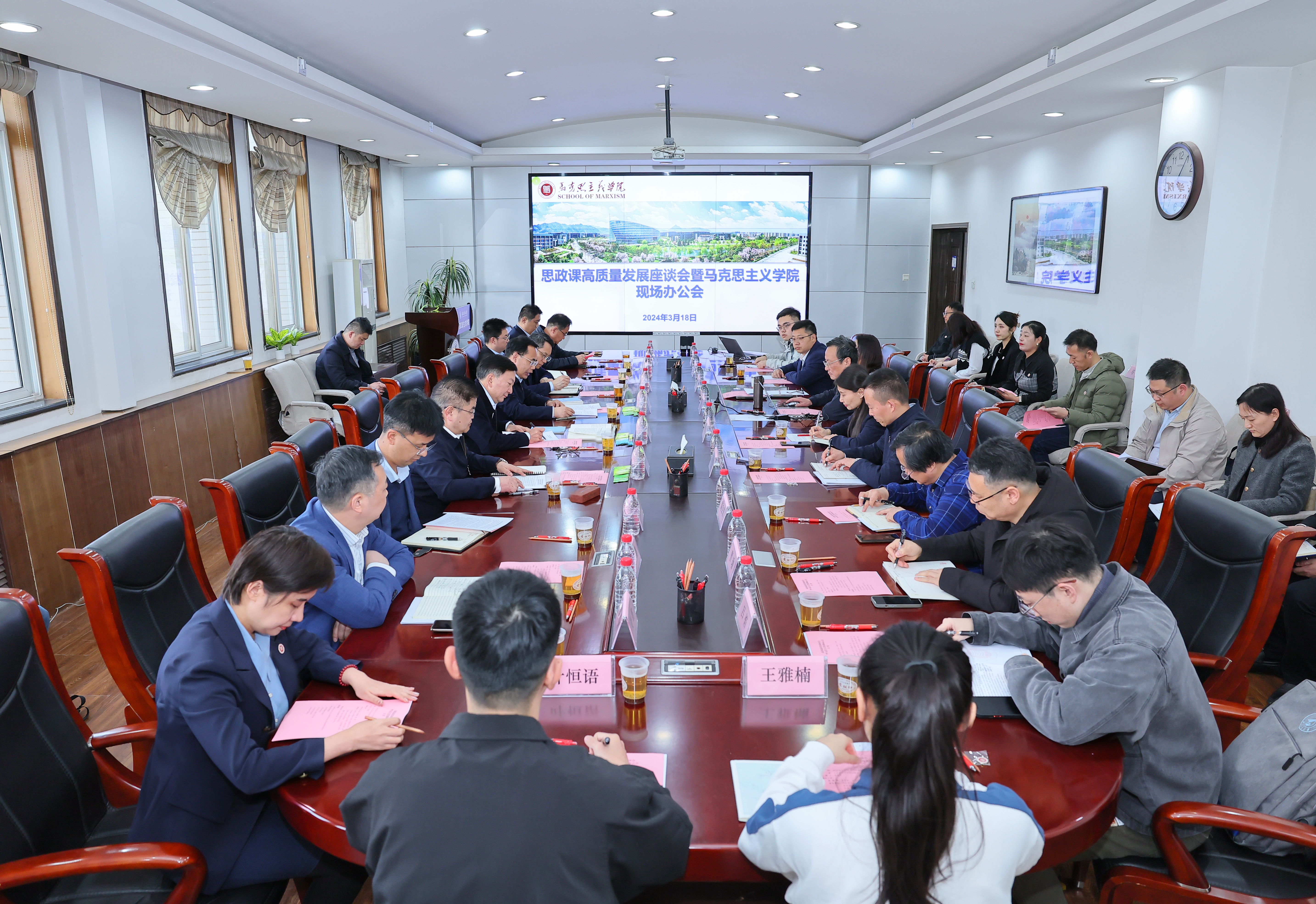 The persons in charge of the Department of Academic Affairs, the Department of Propaganda of the Party Committee, the Department of Student Work of the Party Committee, the Institute of Science and Technology, and the Department of Human Resources (Teachers' Work Department of the Party Committee) focused on the construction of ideological and political theory courses, and made exchanges and seminars in order in the light of their own work.
